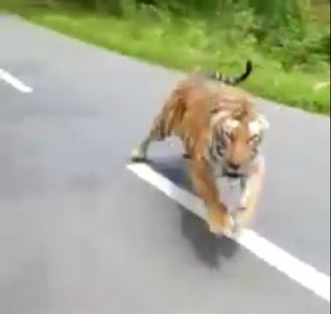 The heart-stopping video was captured by a passenger on the bike when a tiger appeared from the woodland on one side of the road and chased them. Lucky the motorcyclists are safe.